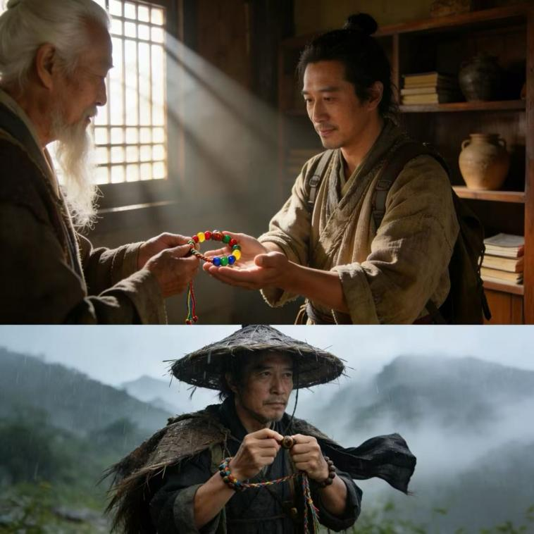 The elder said: "This cord holds your intentions—red for courage, yellow for clarity, green for healing, blue for peace. The bead carries the universe's purest vibration to purify chaos and bring tranquility. Don't resist time's flow; harmonize with it through positive intention and inner peace. When your heart is stable, external turbulence cannot shake you."