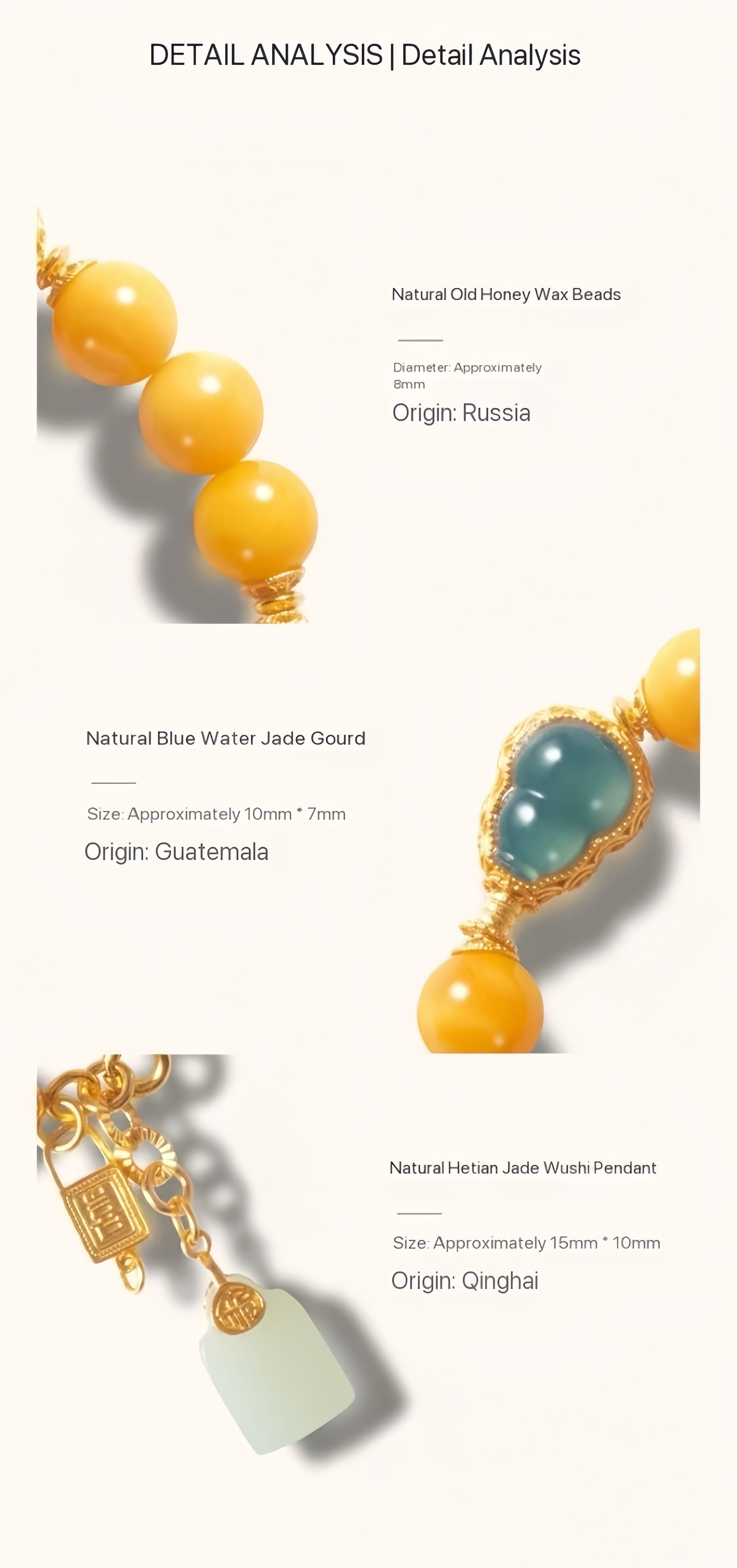 Natural amber, rich in trace elements, is believed in Traditional Chinese Medicine to promote blood circulation and calm the spirit. Natural jadeite, with its cooling property, helps balance internal heat, while natural Hetian jade nurtures the body through its gentle warmth. Together, they create a synergistic "nourish-balance-stabilize" health energy field.