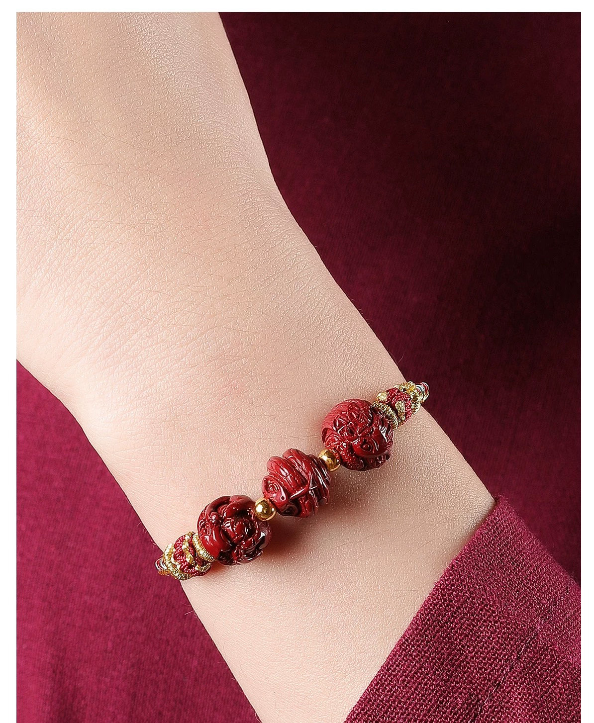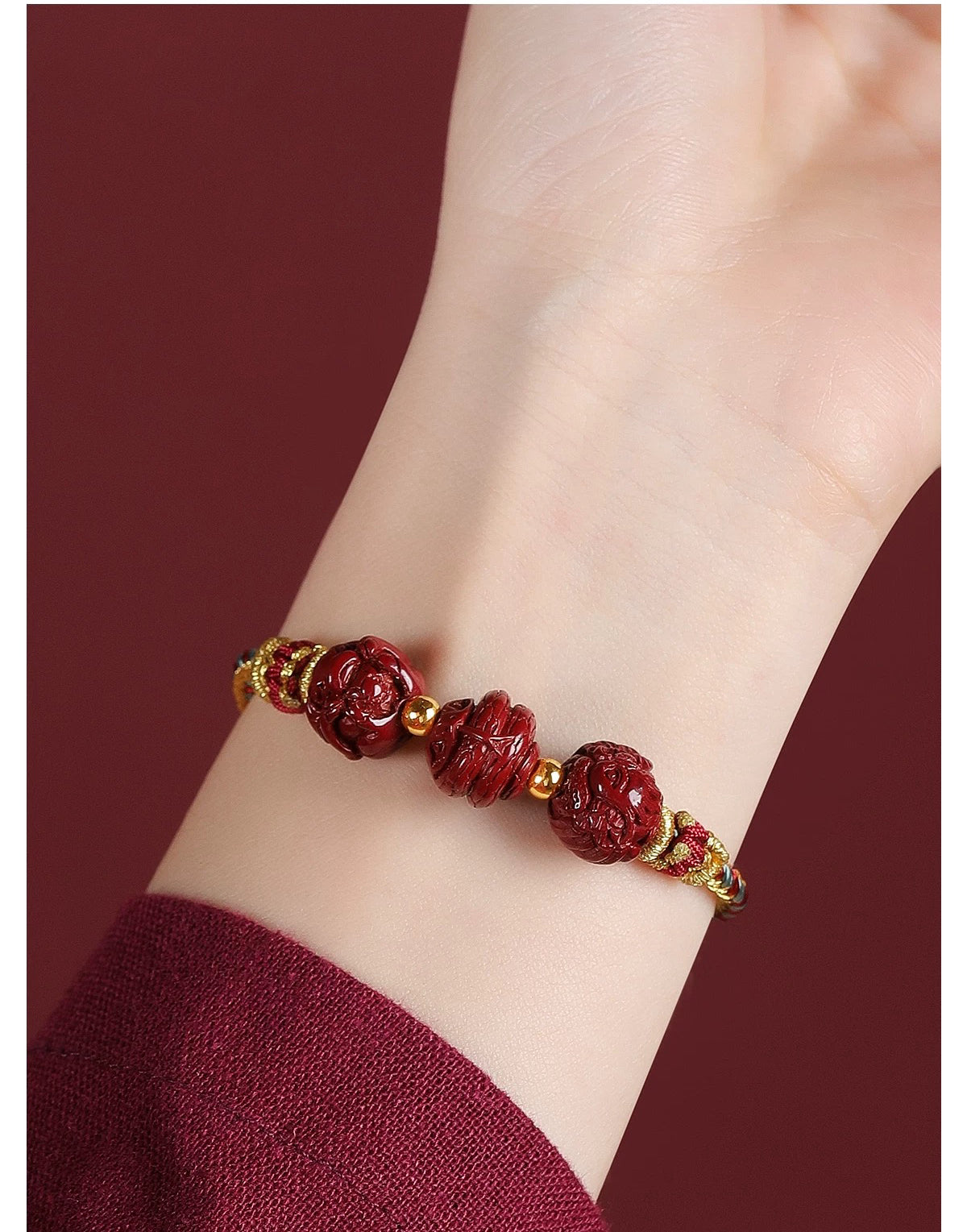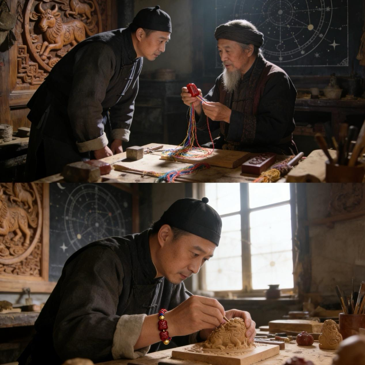 In ancient wisdom, sages taught harmonization with each year's unique energy rhythm rather than confrontation. A craftsman facing an important year sought guidance from a sage, who carved three deep red cinnabar stones with the craftsman's zodiac and his two "Trinity Harmony" benefactor animals. The sage wove a cord with fiery red for protection, calm blue for peace of mind, and brilliant gold to illuminate the path, interweaving the zodiac stones with golden beads.