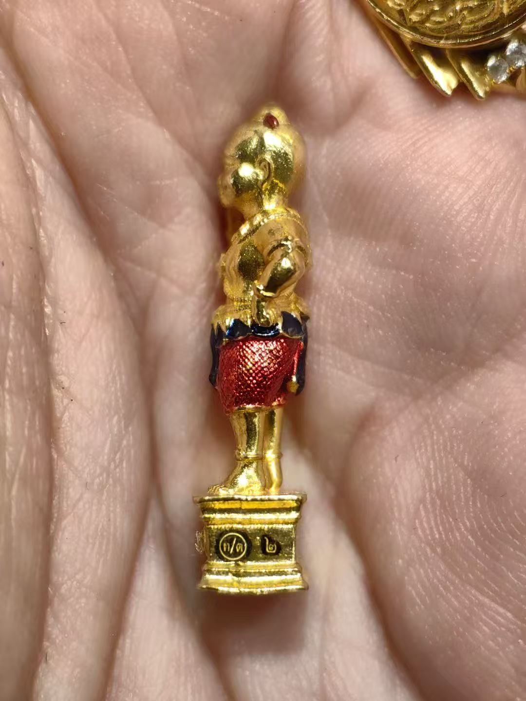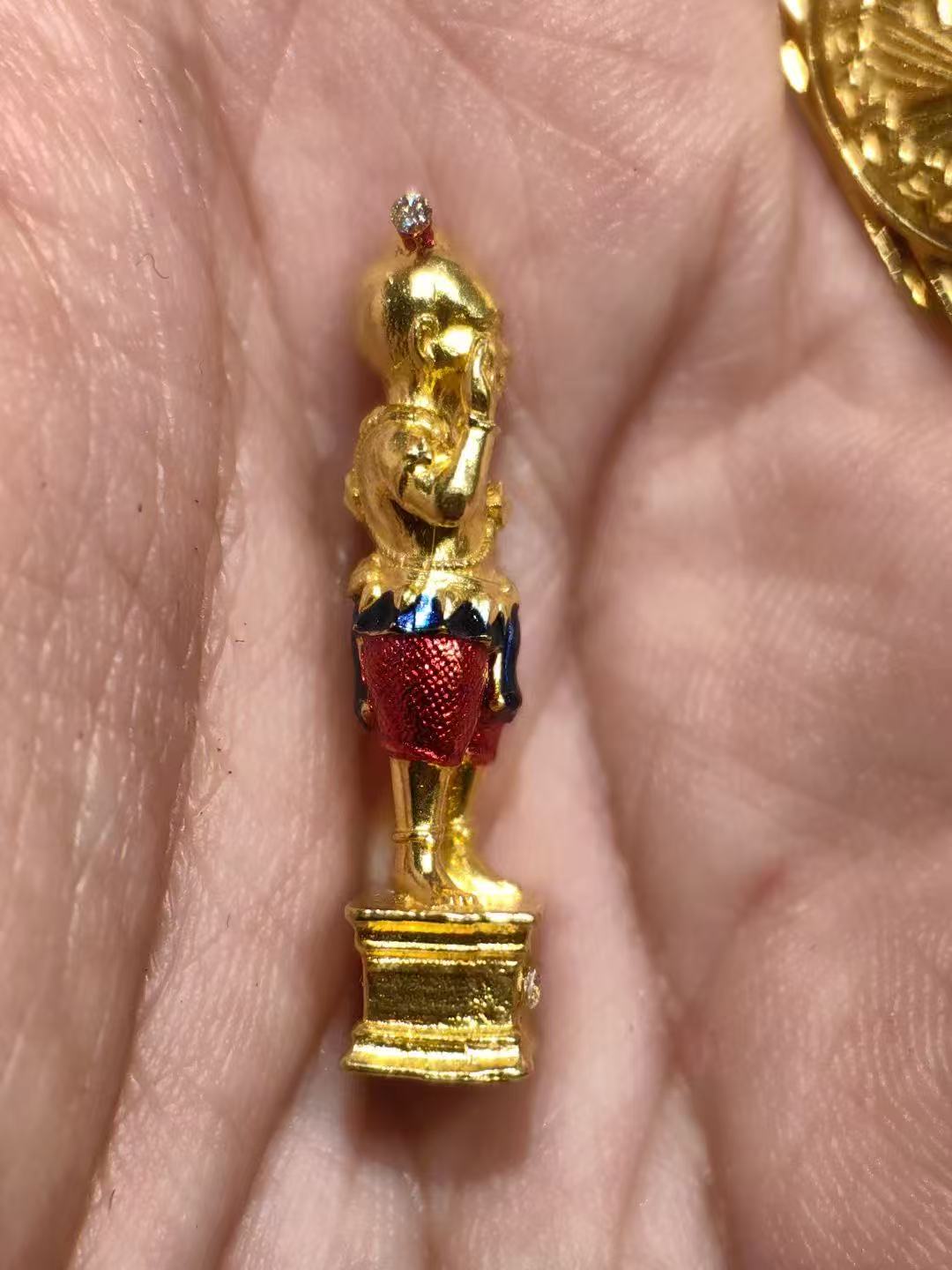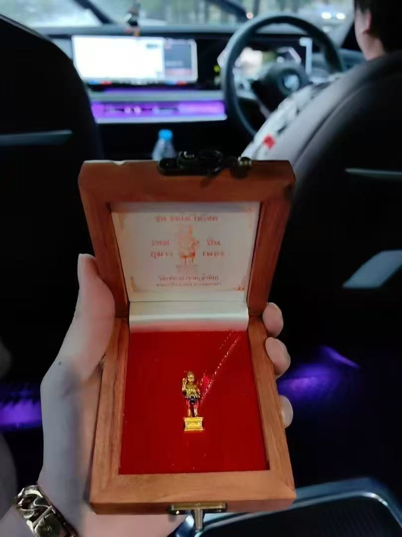 This pure gold Phra Khun Pae is amulet made in 2564 BE (Buddhist Era) by the renowned Thai master S. Kruba Chhocha, the founder of the Phra Khun Pae lineage. It is currently the only pure gold version available on the market. The base of this Phra Khun Pae is inlaid with two natural diamonds, and the hairpin is also inlaid with a diamond. The interior is filled with powders from Luang Phor Tim, Luang Phor Tae Pae, and Luang Phor Hong Seng, and sealed with gold. The Pheng Pei lineage of Gu Thong Man is renowned throughout Thailand. Currently, only the master Kruba Que possesses the ancient Pheng Pei magic. Pheng Pei Gu Thong Man combines the advantages of infusion and spiritual power. The materials used in its production include powders from Luang Phor Tim, Luang Phor Tae, and Luang Phor Hong Seng. The powders multiply the spiritual power of the Gu Thong Man after infusion, giving it divine power. According to the temple, every devotee who attends a Pheng Pei Gu Thong ceremony wins the lottery and enjoys excellent fortune, a story that has become a local legend.