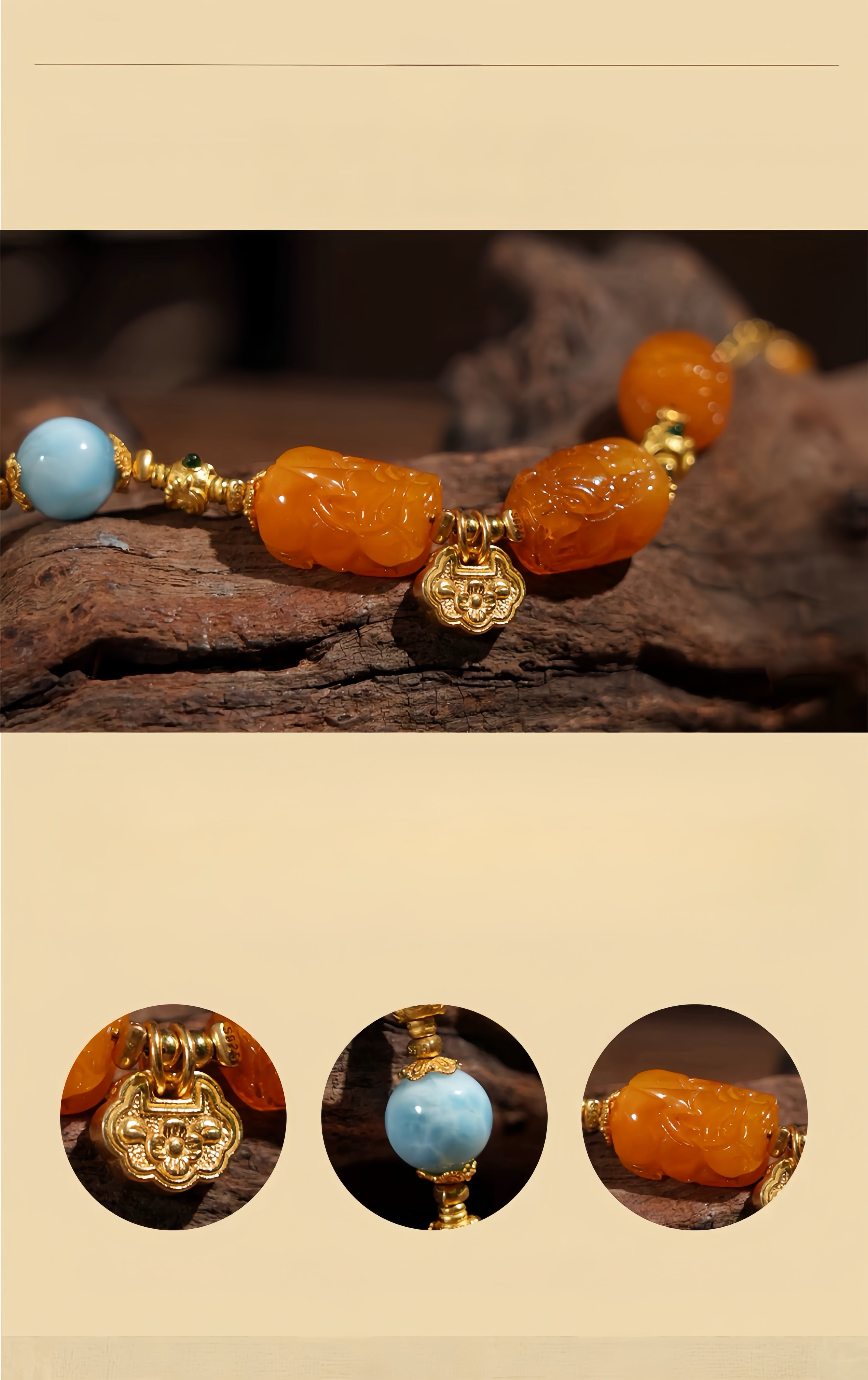 This bracelet is crafted to attract career mentors and unlock opportunities—a personal declaration of protective, wise, and abundant energy. It unites a guardian lock, clear-communicating Larimar, warm attracting amber, and wealth-drawing Pi Xiu.