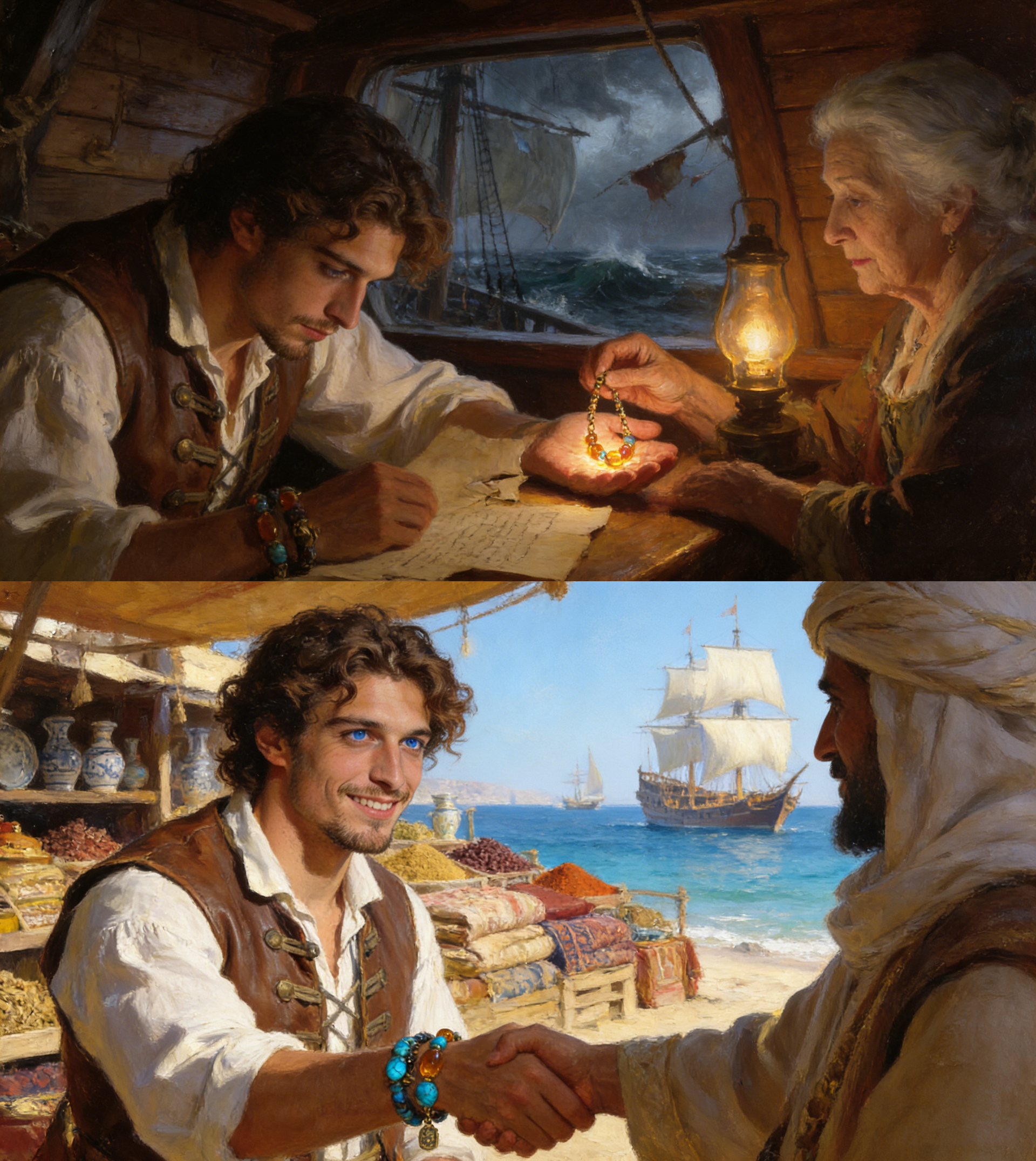 A struggling young merchant named Cyrus received a family bracelet from his wise grandmother before a voyage. It was made of amber (to attract fortune), Larimar (to understand and communicate), a golden protective lock (for safety), and a Pi Xiu carving (to guard wealth).