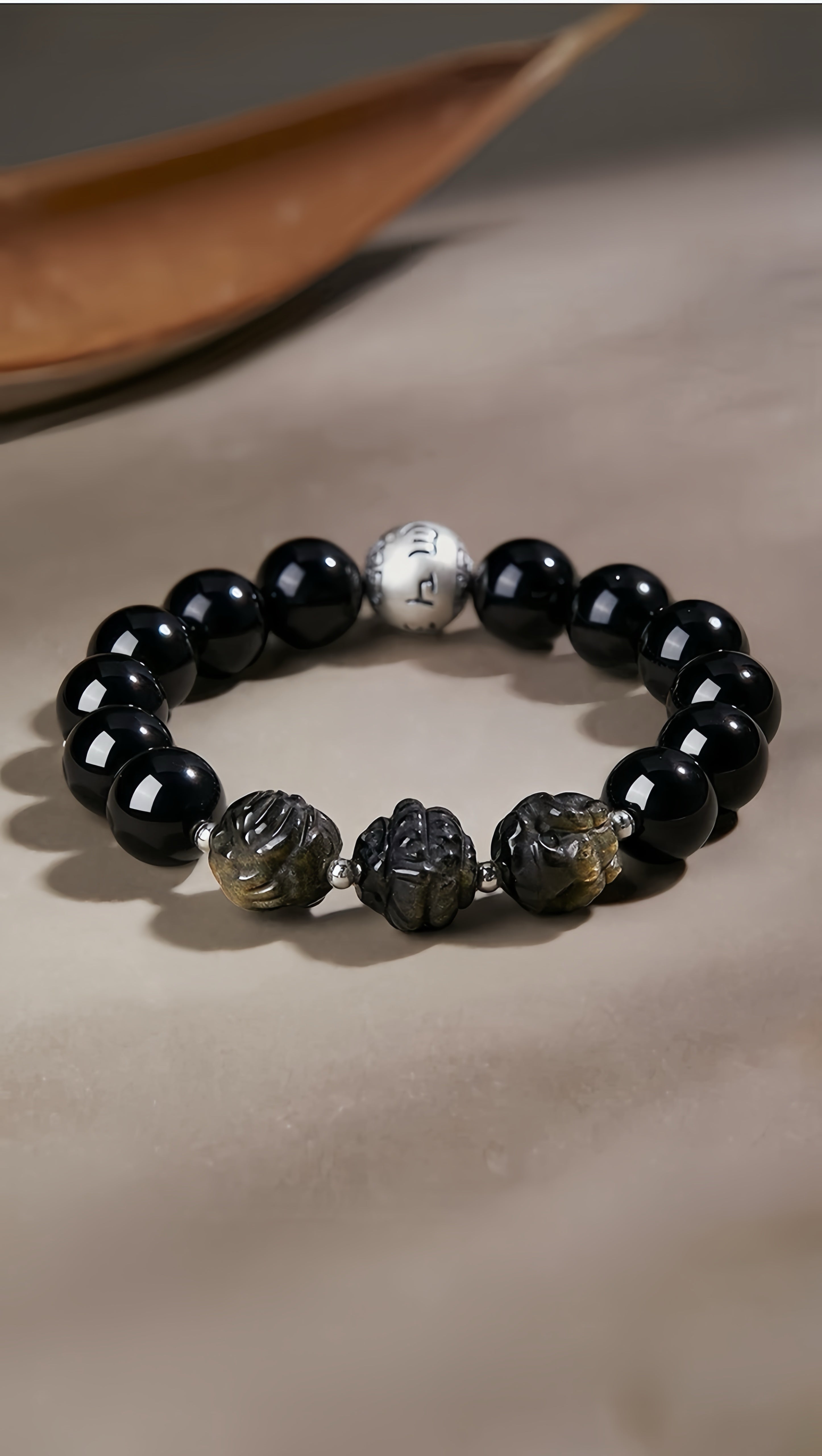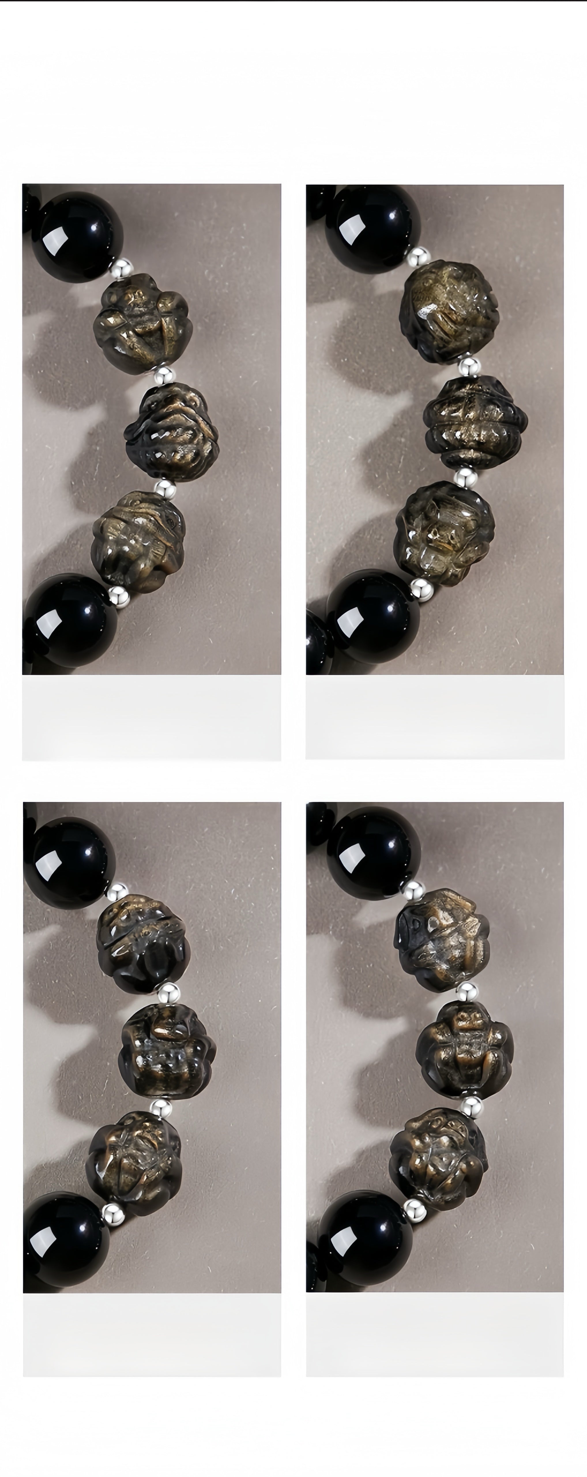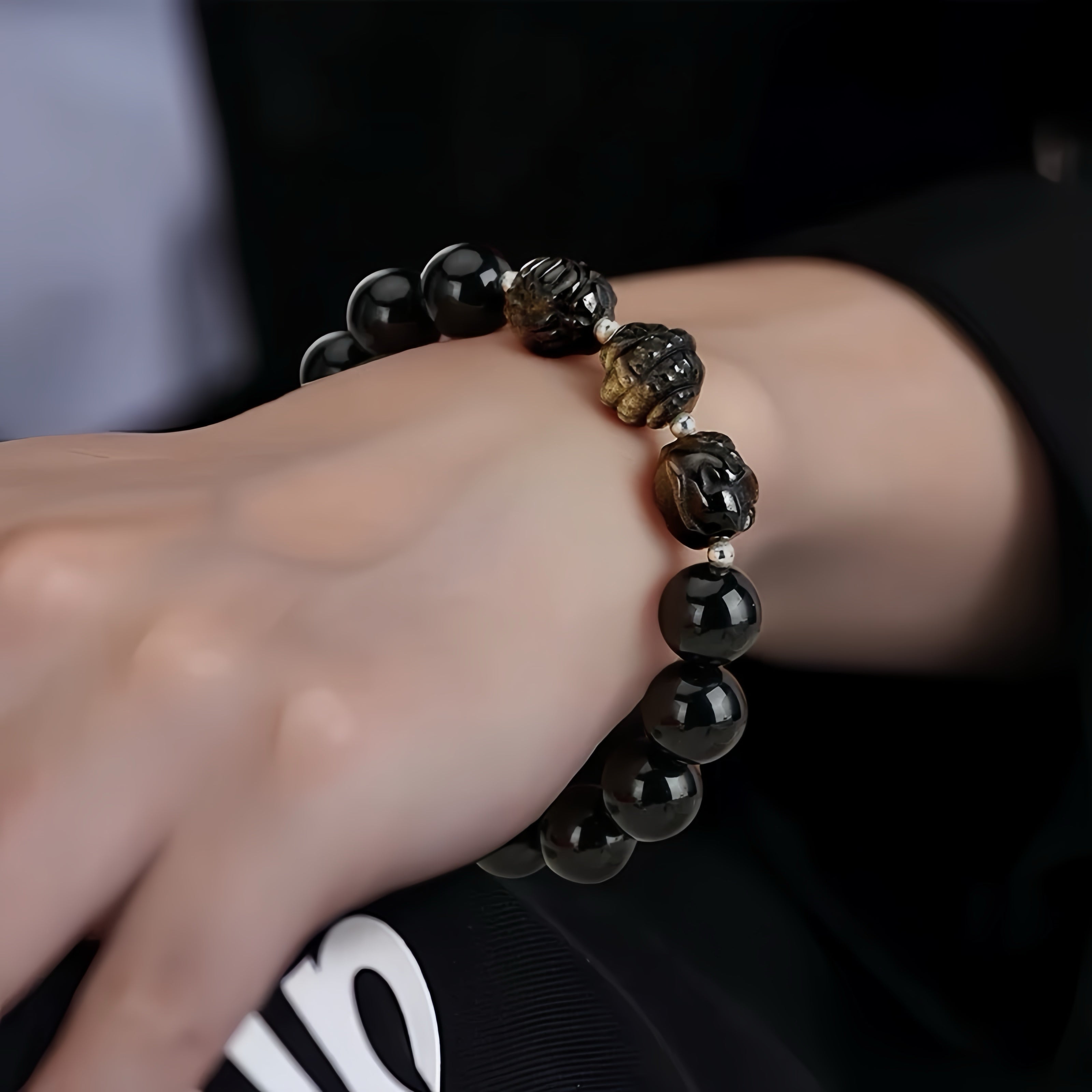 This bracelet is a personal energy system for grounding income and expanding career wealth, uniting ancient wisdom with modern purpose. It layers protective black obsidian with starlike golden sheen obsidian to attract prosperity within a shielded field.