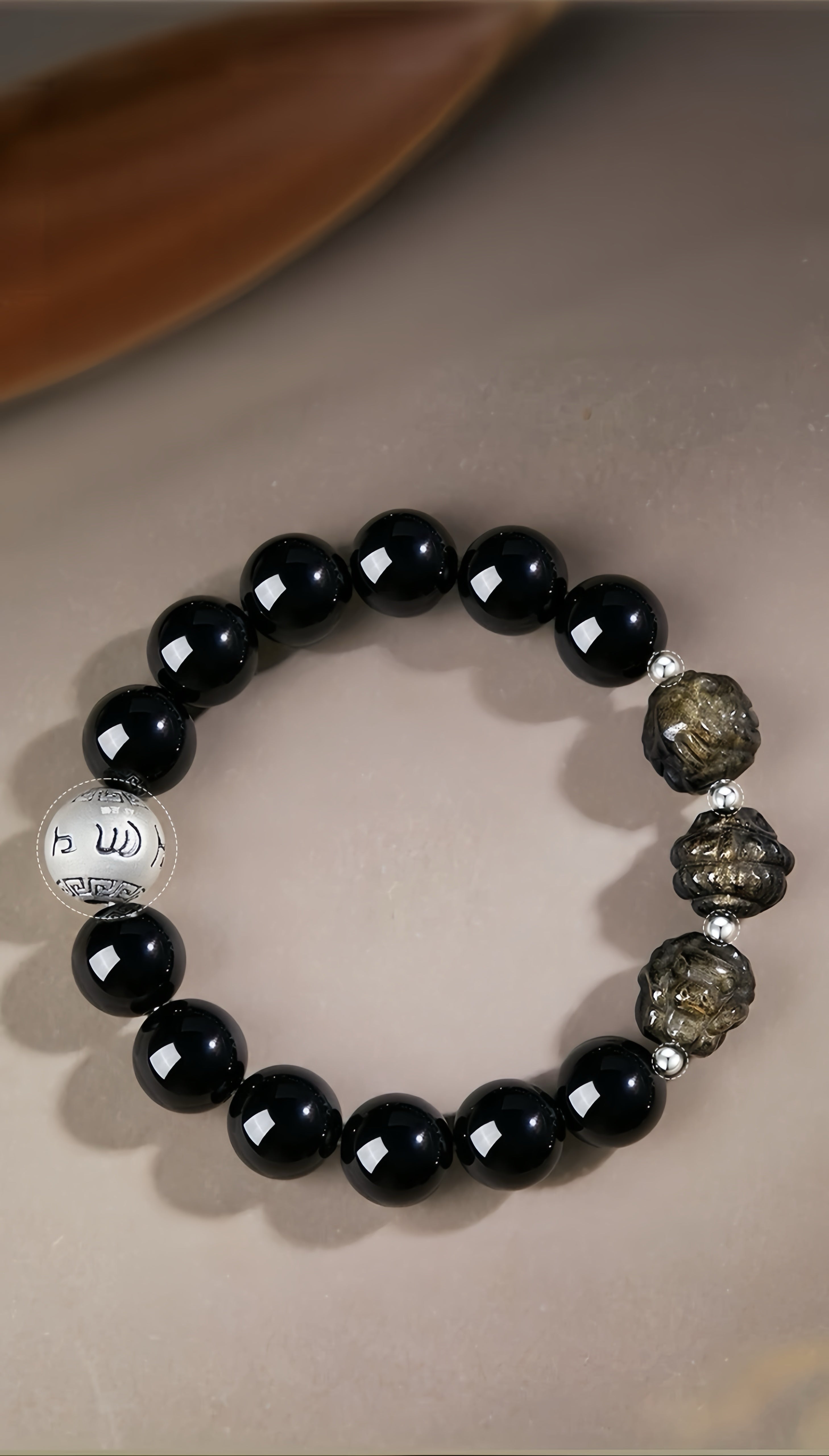 On the Silk Road, an honorable jade merchant named Lu Wen helped a traveling monk. Years later, the monk returned the kindness by crafting a unique talisman: black obsidian for grounding, golden sheen obsidian for illumination, two zodiac symbols aligned with Lu Wen's sign, and a sacred mantra for focus.