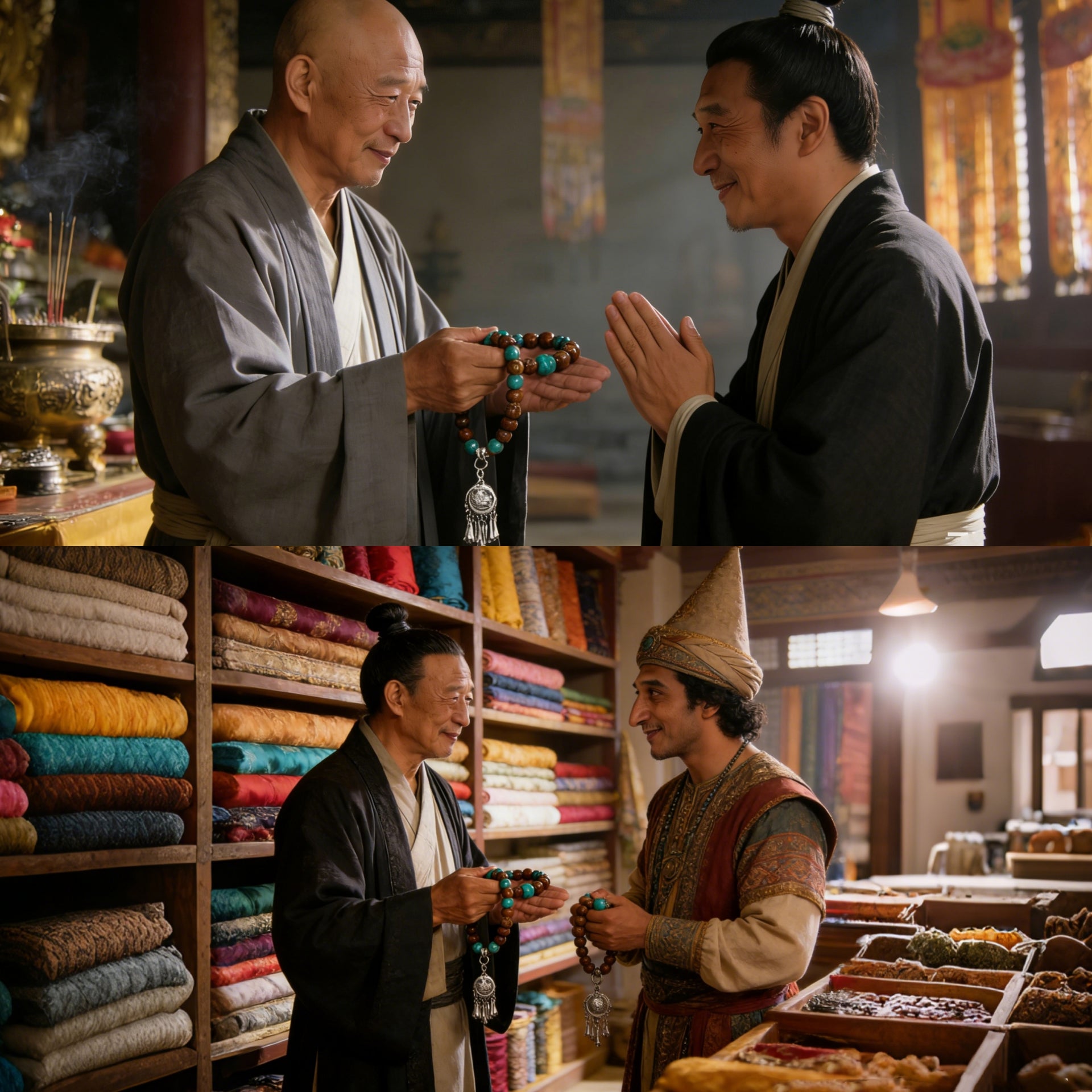 A merchant, kind-hearted yet plagued by misfortune, was guided by a monastery's high monk who gifted him turquoise (for courage) and agarwood (for clarity), instructing him to turn the prayer wheel with devotion.